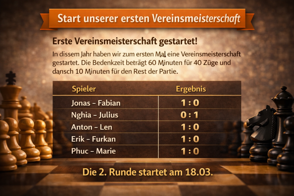 Mit diesen Ergebnissen ist der Startschuss für die Meisterschaft gefallen. Die zweite Runde findet am 18. März statt. Wir freuen uns schon jetzt auf weitere spannende Partien und wünschen allen Teilnehmern